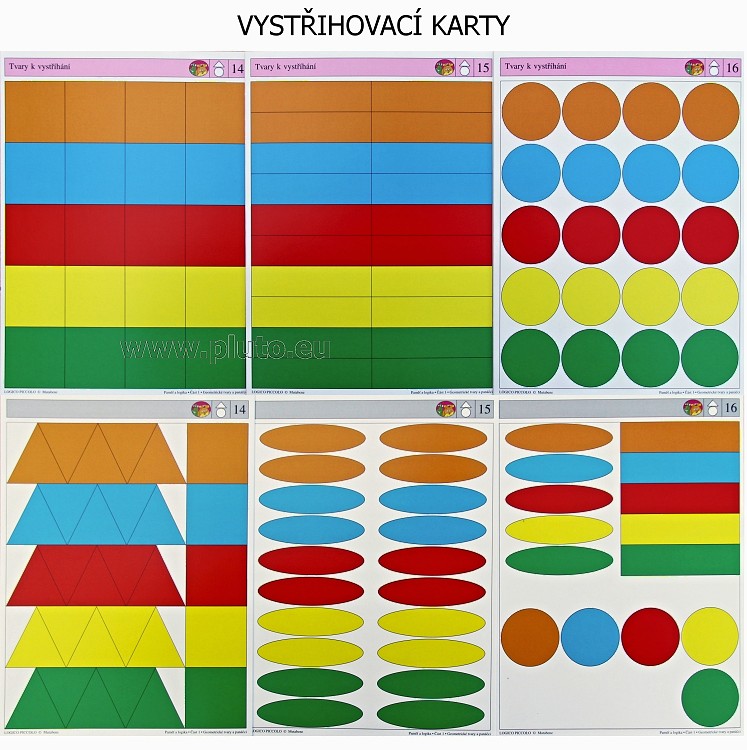 Sučástí souboru jsou i barevné tvary k vystříhání. Soubor je v praktické krabičce, do níž lze vystříhané tvary i karty snadno uložit.
